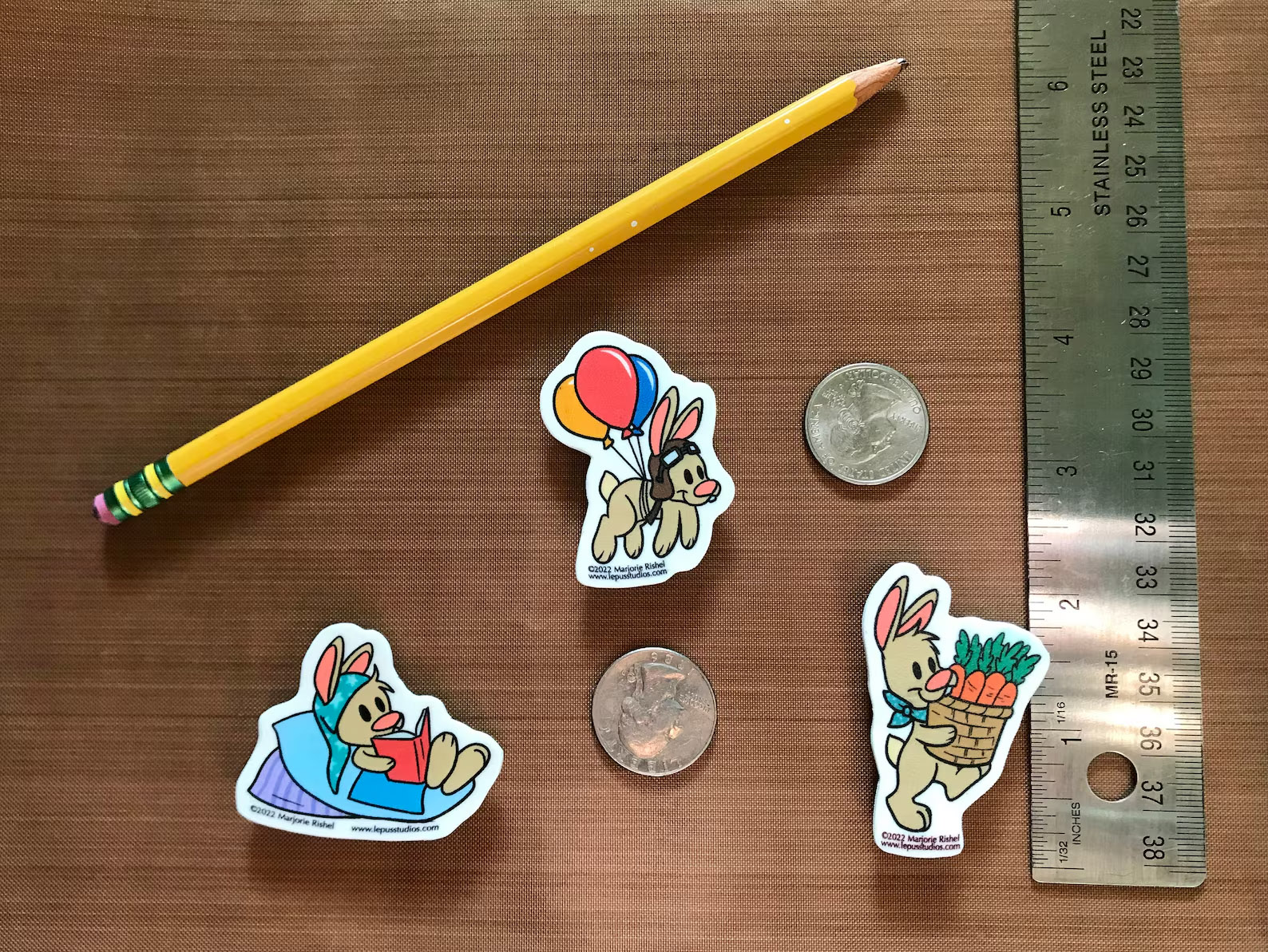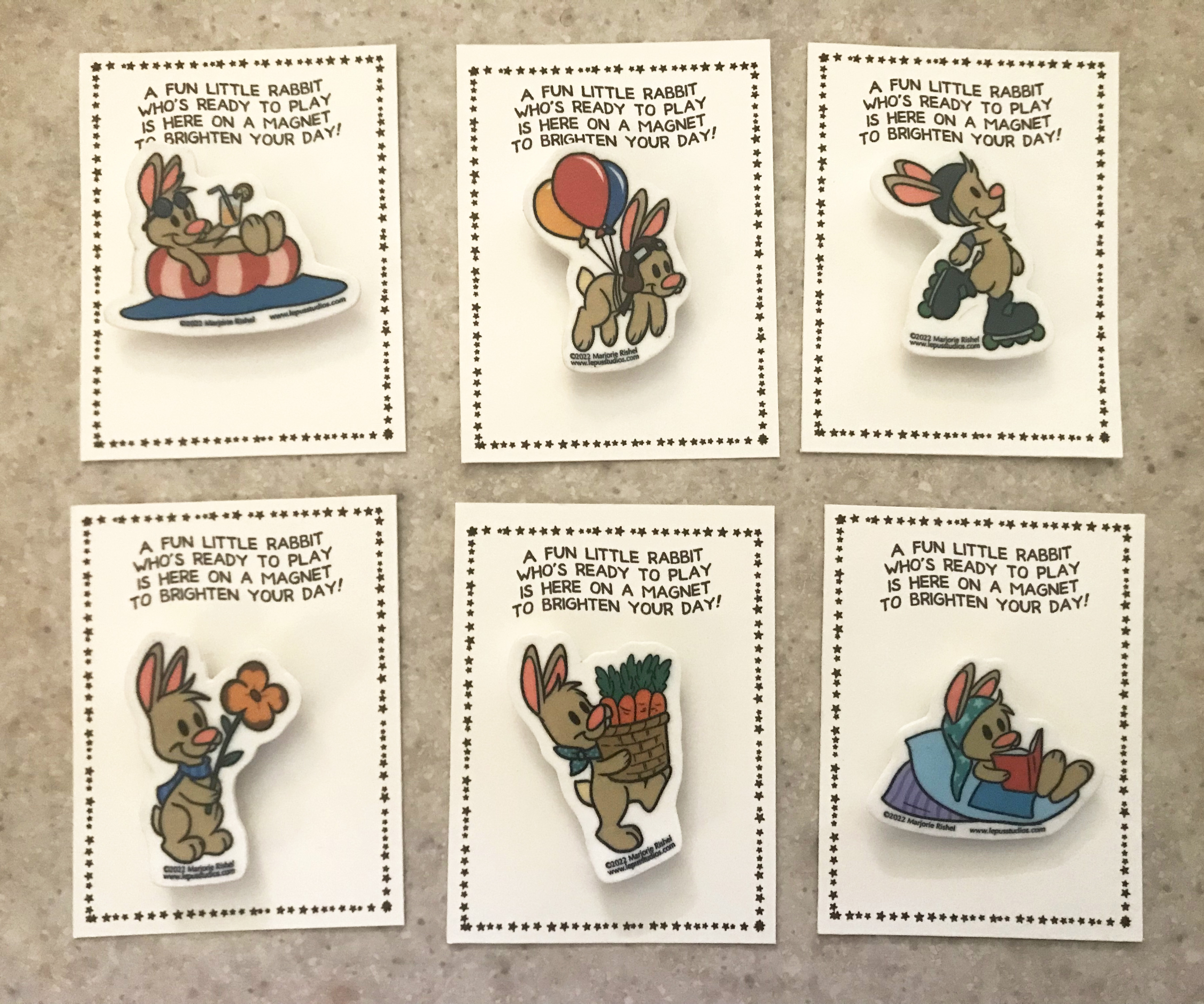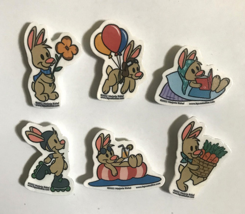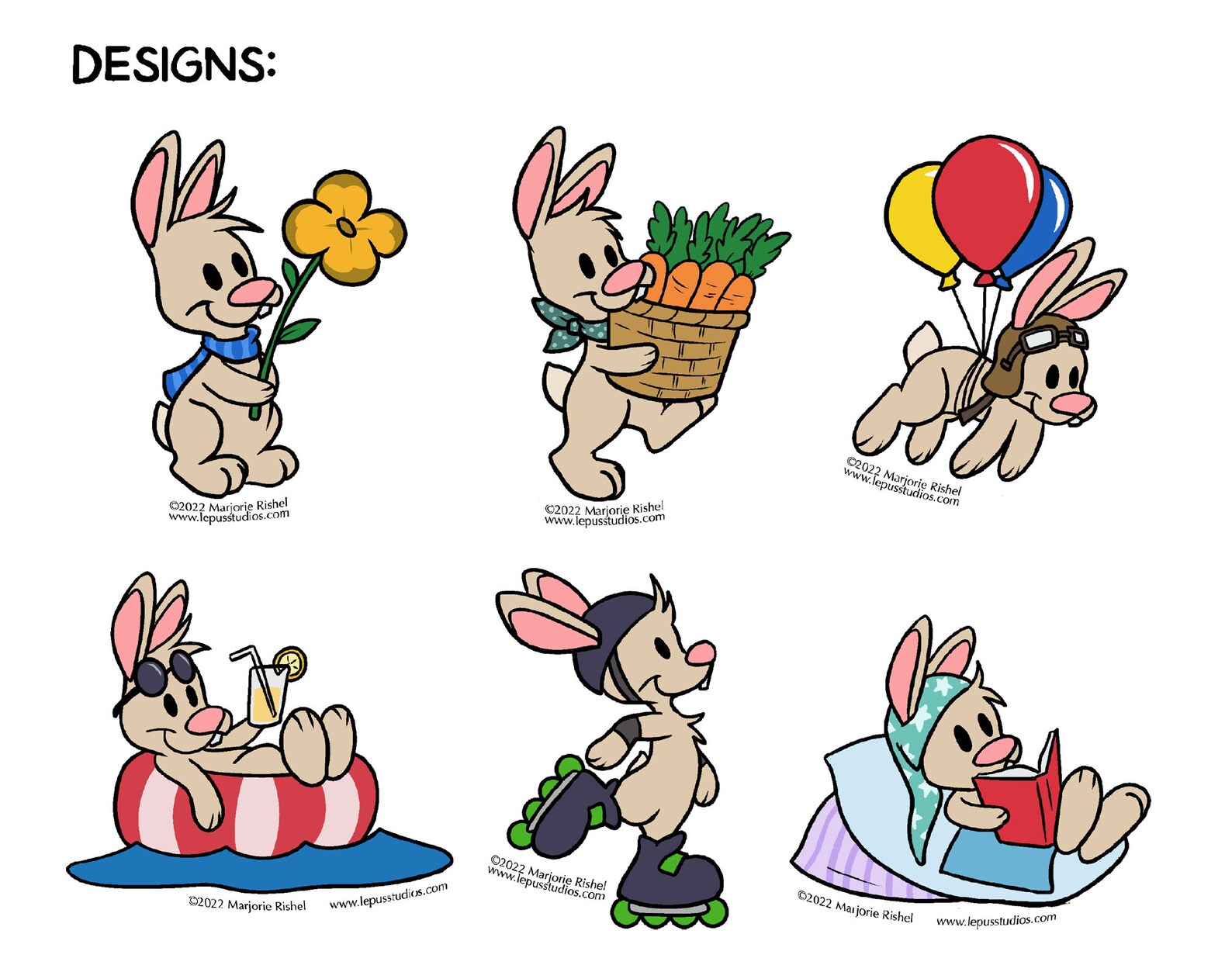 Six Designs in a set: "Flower," Carrot Bushel," "Balloons," "Floating on Water," Bedtime Reading," and "Roller Blades"