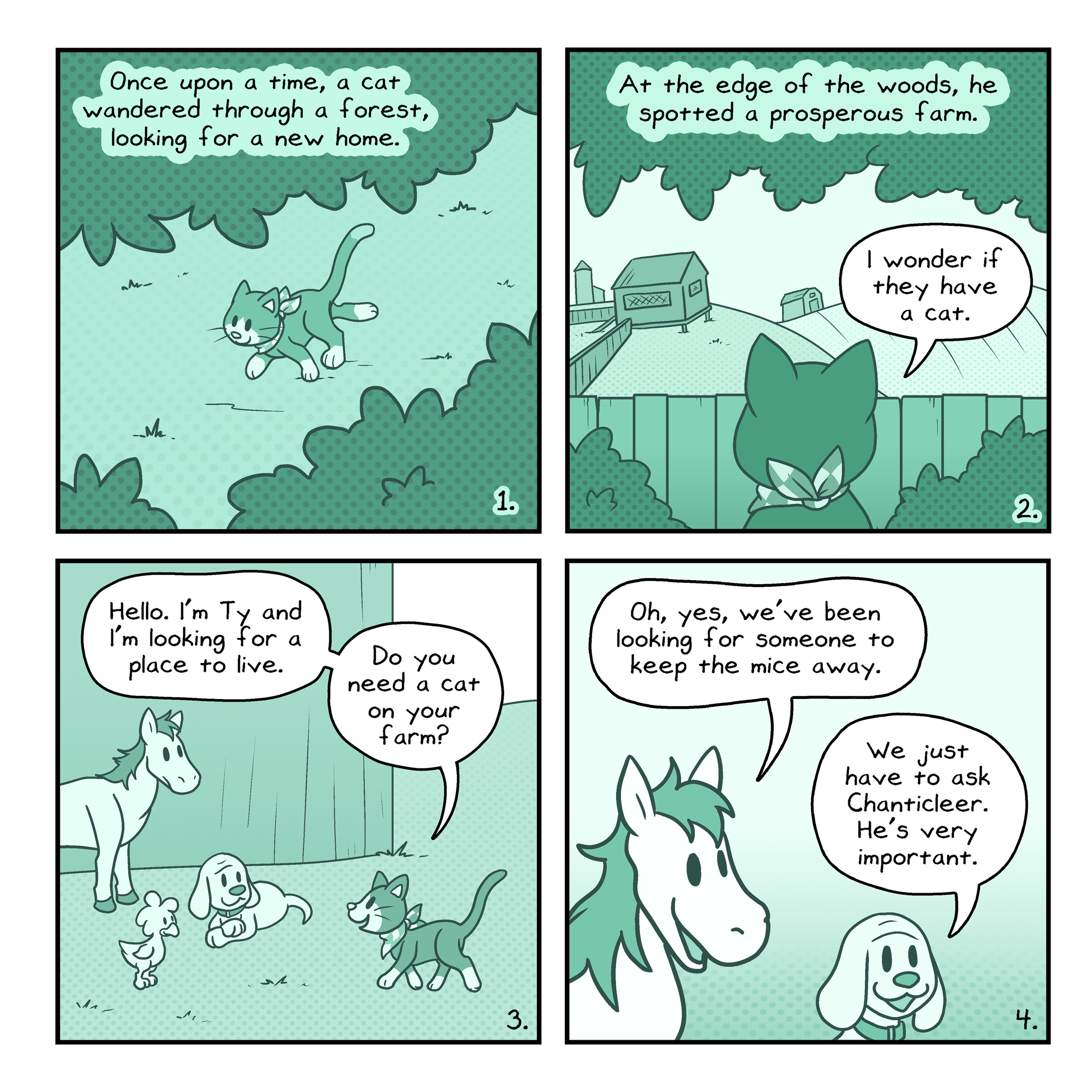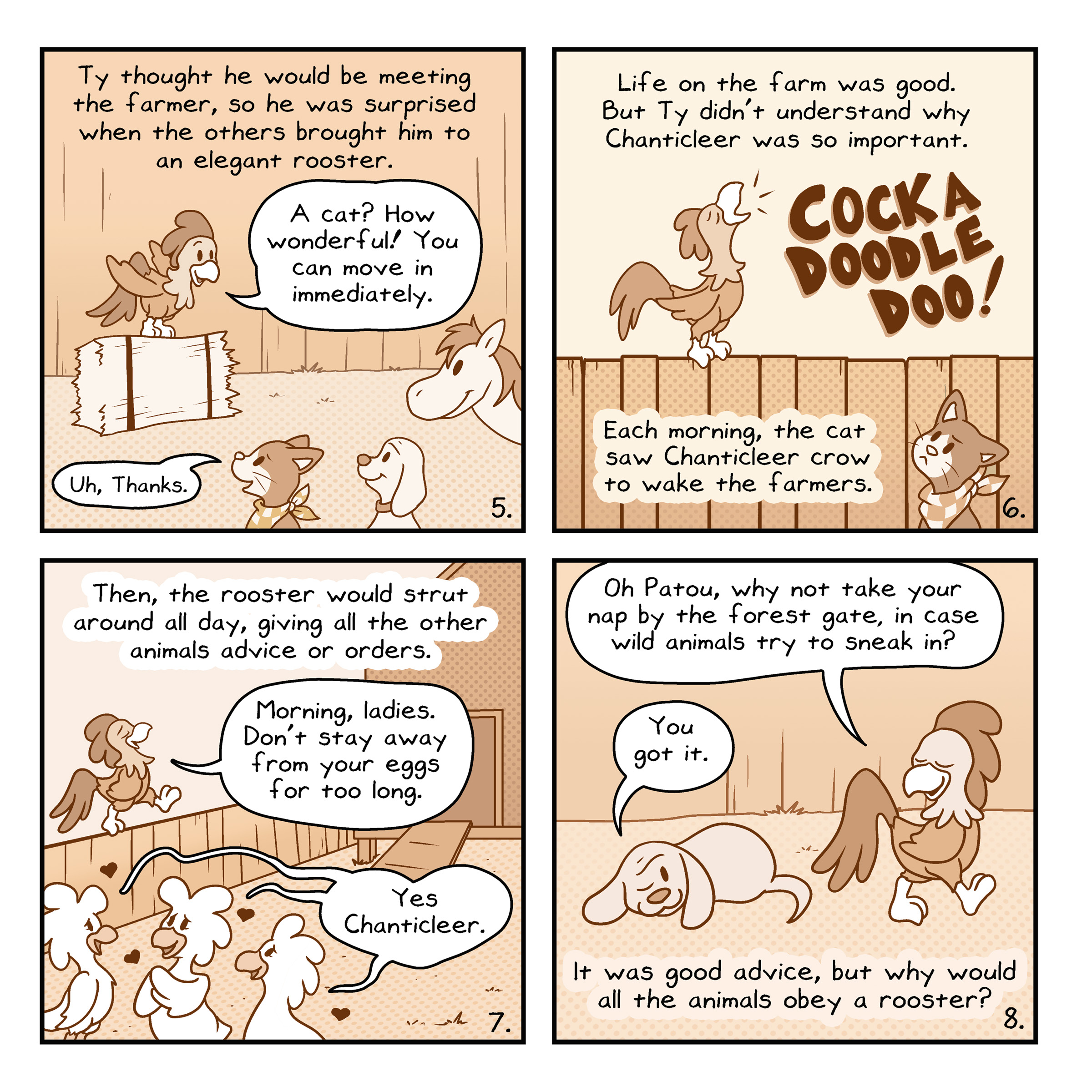 A little comic based on the old folk tales of Chanticleer the Rooster and his animal friends. Can a rooster's crow really wake the sun, or is Chanticleer's bravado about to get him into trouble? Limited color, 72 panels, 20 pages.
