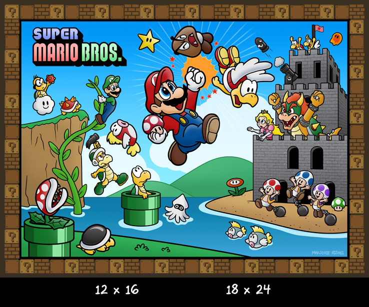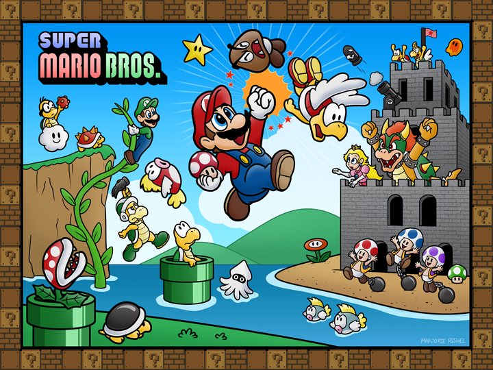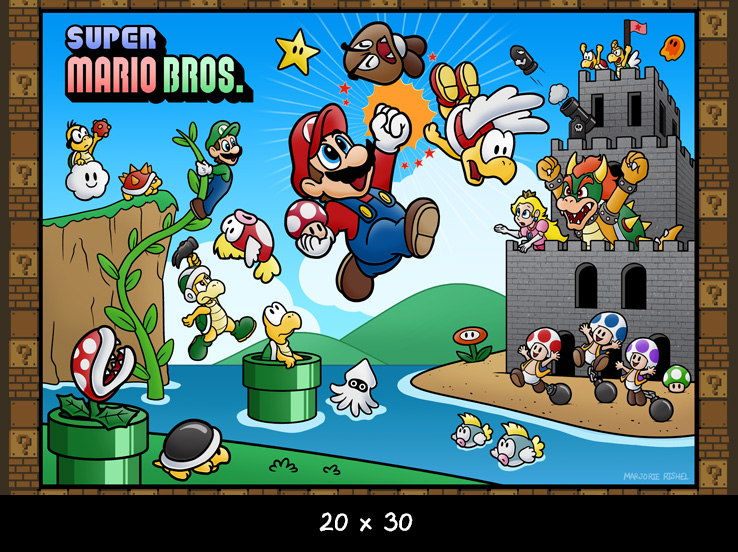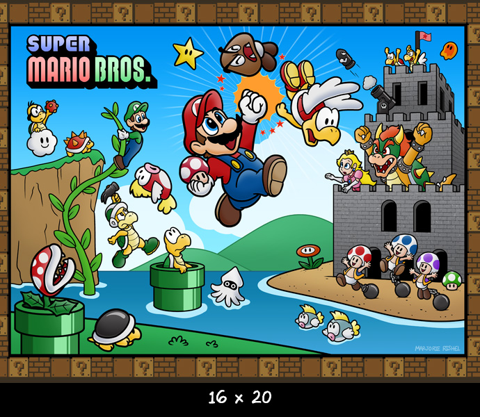 To celebrate the 40th Anniversary of the original Super Mario game, here's a new illustration of the classic game art, updated with modern designs. Includes all characters from the original game.